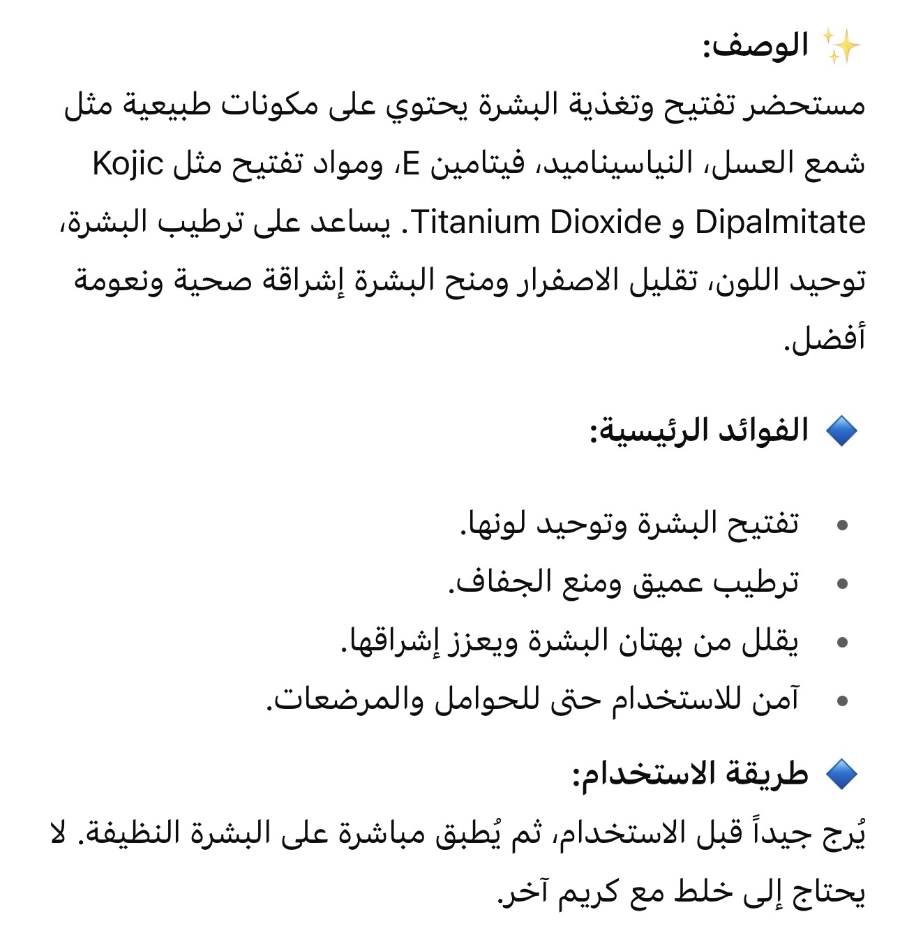 كريم فعّال لتفتيح وتقشير اليدين والقدمين، يزيل الخلايا الميتة بلطف ويمنح البشرة ملمساً ناعماً ولوناً موحداً. تركيبة آمنة تناسب جميع أنواع البشرة، حتى للحوامل والمرضعات.