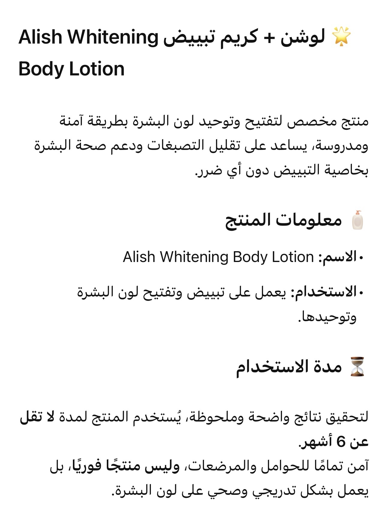 • النتائج تختلف من بشره لي بشره من حيث المده لكريمات تبعنا مش تبيض فوري اهتمامك ب البشره راح يولد لك نتيجه حلوه ودائمه بشكل امن